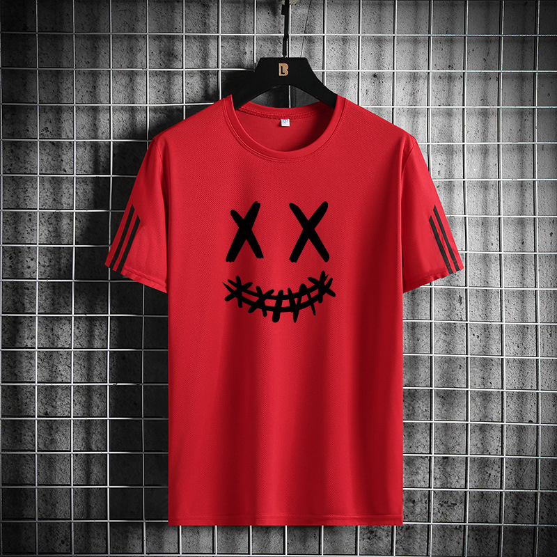 GAR BETHE Three Bar Trendy Men's Printed Sports Set With Smiling Face Pattern, Mesh Breathable Round Neck T-shirt, Two-piece Pants Set New