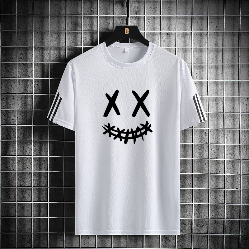 GAR BETHE Three Bar Trendy Men's Printed Sports Set With Smiling Face Pattern, Mesh Breathable Round Neck T-shirt, Two-piece Pants Set New