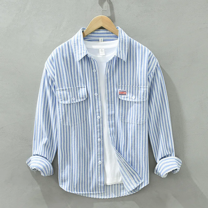 GAR BETHE Spring And Autumn New Pure Cotton Striped Men's Long-sleeved Shirt Loose Casual Fresh And Artistic Cargo Blue Tops C2126